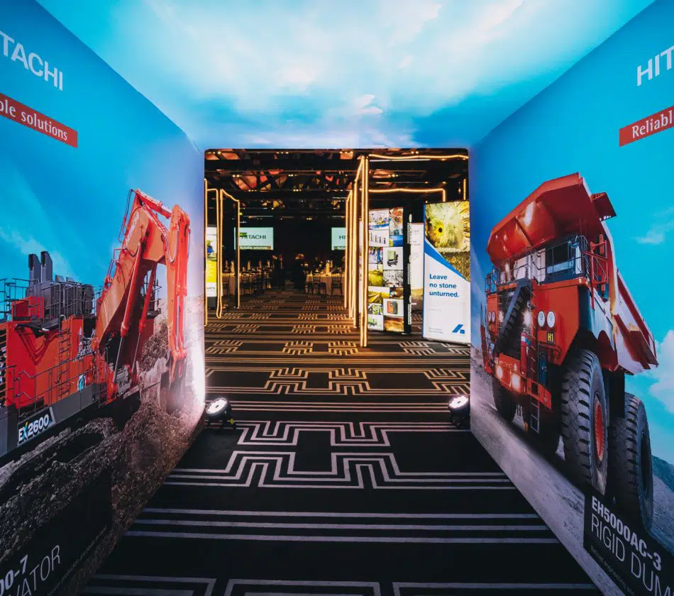 The Hitachi AIMEX stand featured four television displays, a coffee machine, two meeting pod rooms as well as giveaways for visitors. As guests walked into The Dome at Sydney Showground they were greeted by a Hitachi ZW370-5 wheel loader on display.